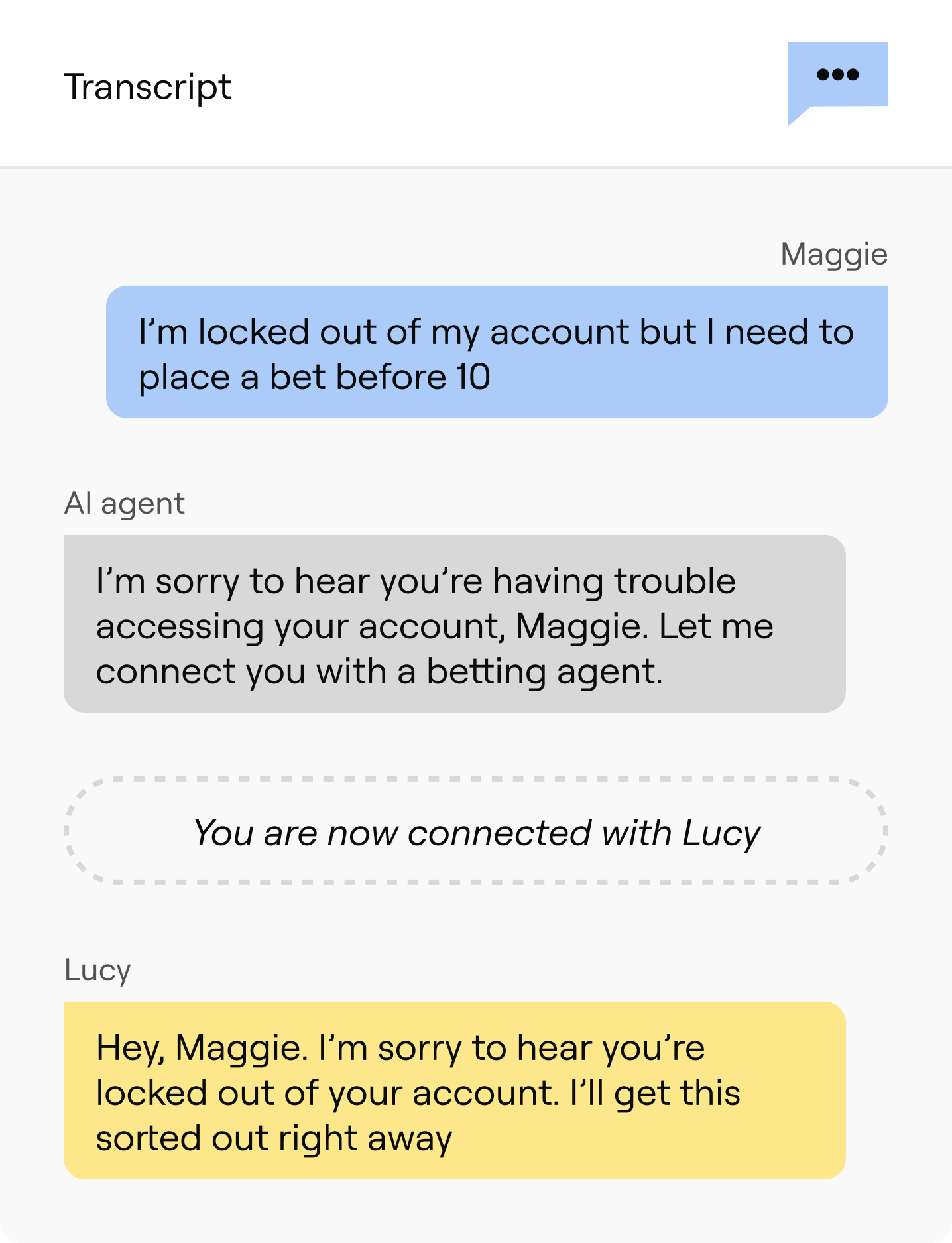 Seamlessly transfer complex inquiries to human agents with full interaction history for faster resolution.