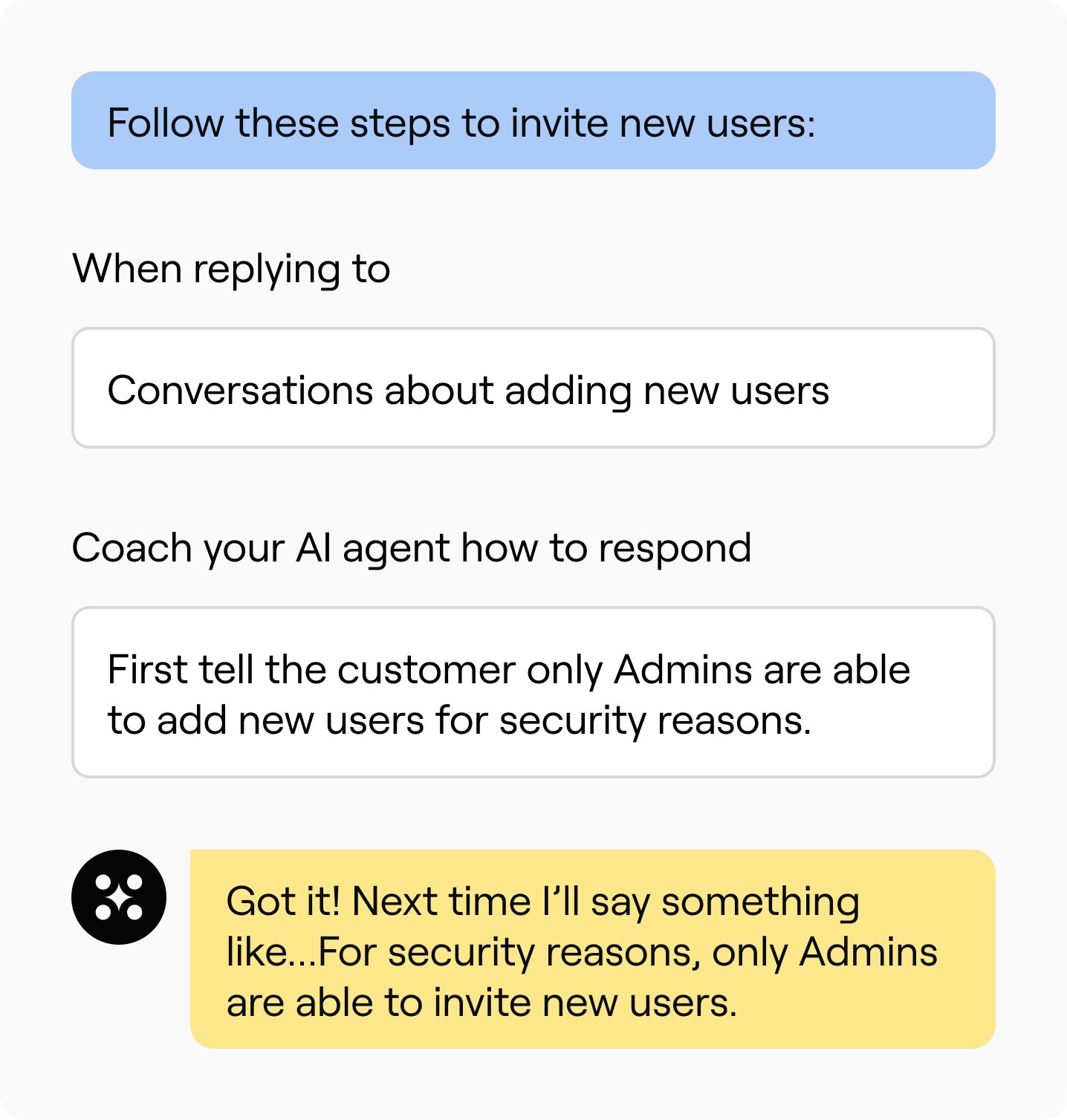 Provide targeted feedback to fine-tune your AI Agent’s behavior and improve how it handles future inquiries.
