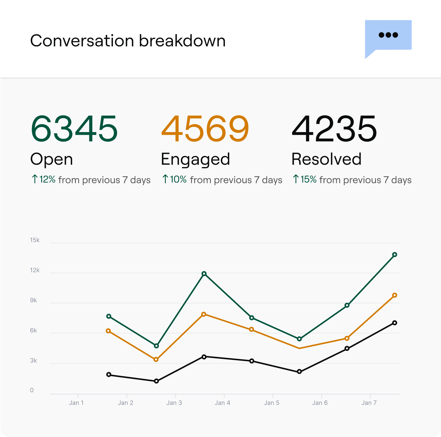 Understand your AI Agent’s performance across channels with built-in dashboards and real-time metrics.